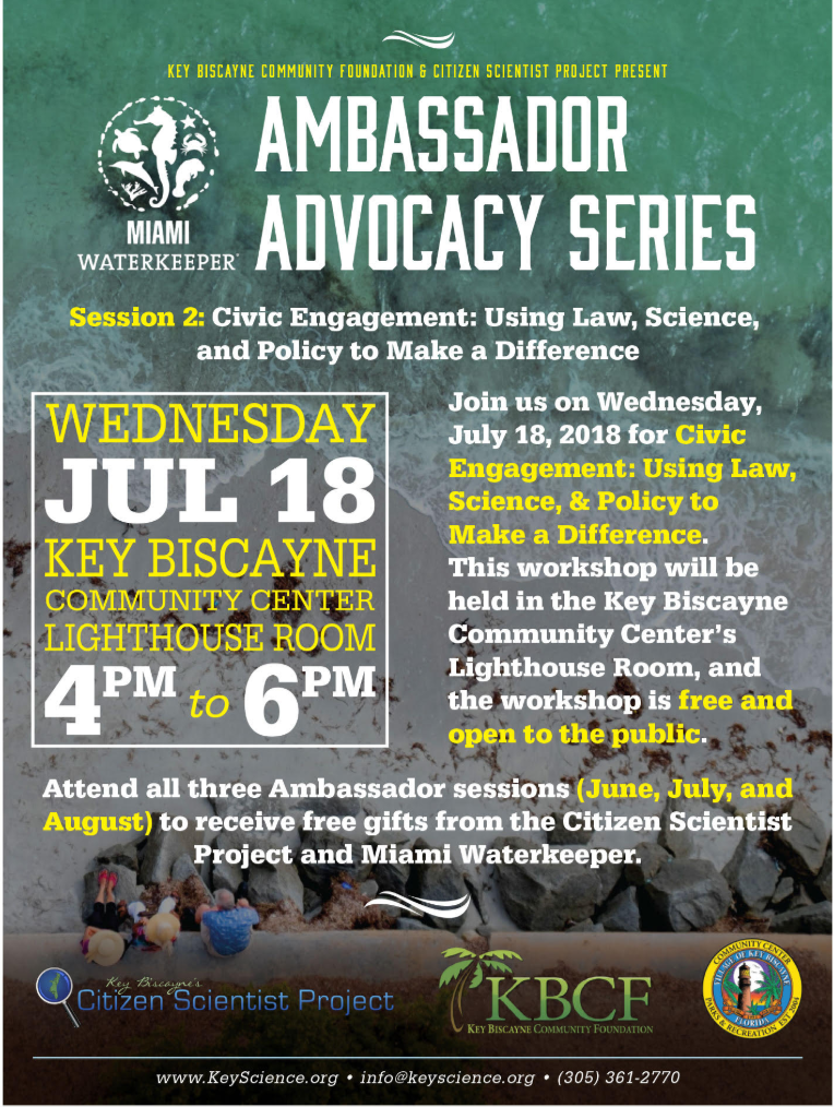 Join us on Wednesday, July 18, 2018 for Civic Engagement: Using Law, Science, & Policy to Make a Difference. This workshop will be held in the Key Biscayne Community Center’s Lighthouse Room, and the workshop is free and open to the public.