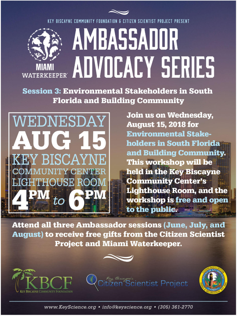 Join us on Wednesday, August 15, 2018 for Environmental Stakeholders in South Florida and Building Community. This workshop will be held in the Key Biscayne Community Center’s Lighthouse Room, and the workshop is free and open to the public.