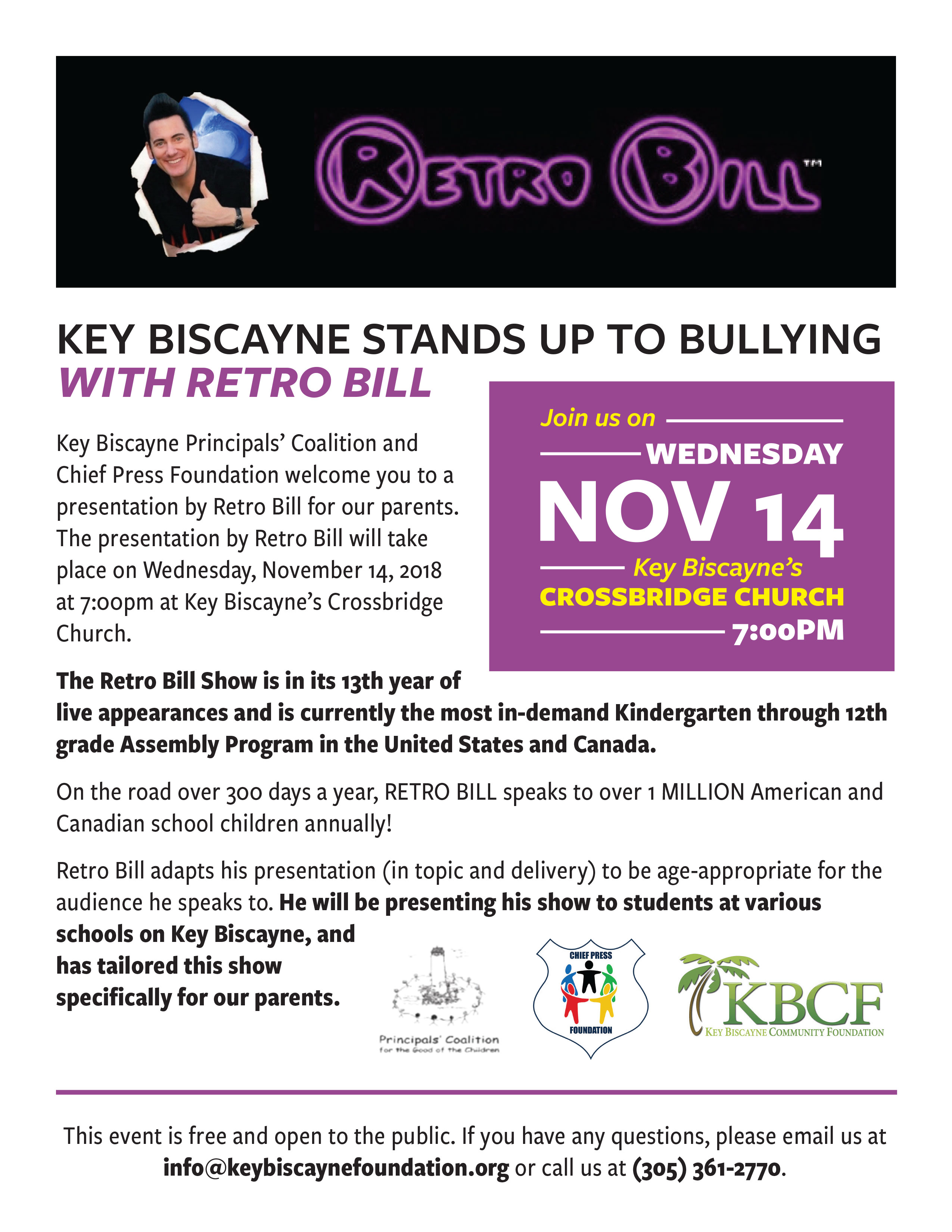 Key Biscayne Principals’ Coalition and Chief Press Foundation welcome you to a presentation by Retro Bill for our parents. The presentation will take place at Key Biscayne’s Crossbridge Church.